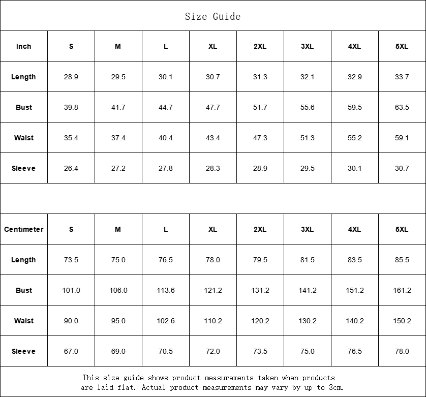 | Centimeter | S | M | L | XL | 2XL | 3XL | 4XL | 5XL |